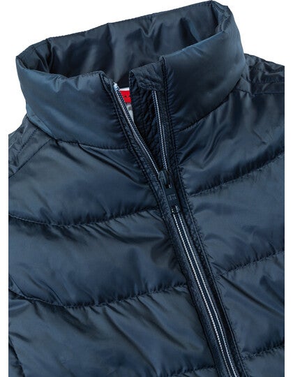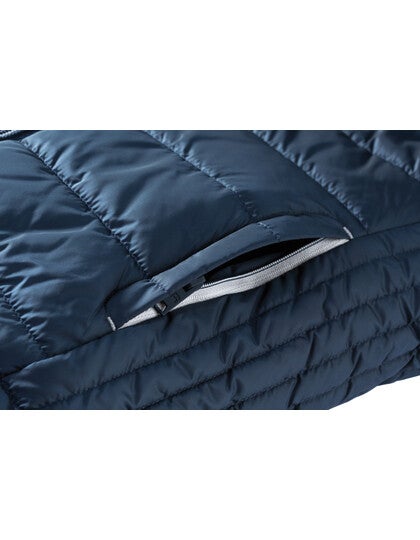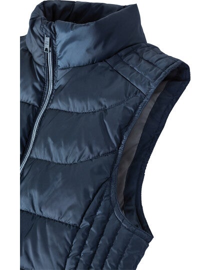 Der Bodywarmer verfügt über einen Stehkragen mit Kinnschutz und einen durchgehenden Reißverschluss mit Windschutzleiste innen. Die Zips und das Futter sind in einer Kontrastfarbe gehalten, was dem Bodywarmer eine moderne Optik verleiht. Praktische Seitentaschen und eine Innentasche mit Reißverschluss bieten ausreichend Stauraum für persönliche Gegenstände.